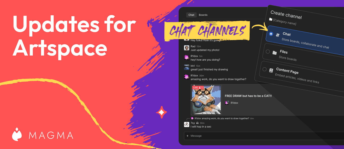 Artspaces are all about community. And communities, often do more than just draw on the canvas together. Sometimes you need a space for everyone to just chat or to share announcements. For this, we’ve added Artspace chat channels!
