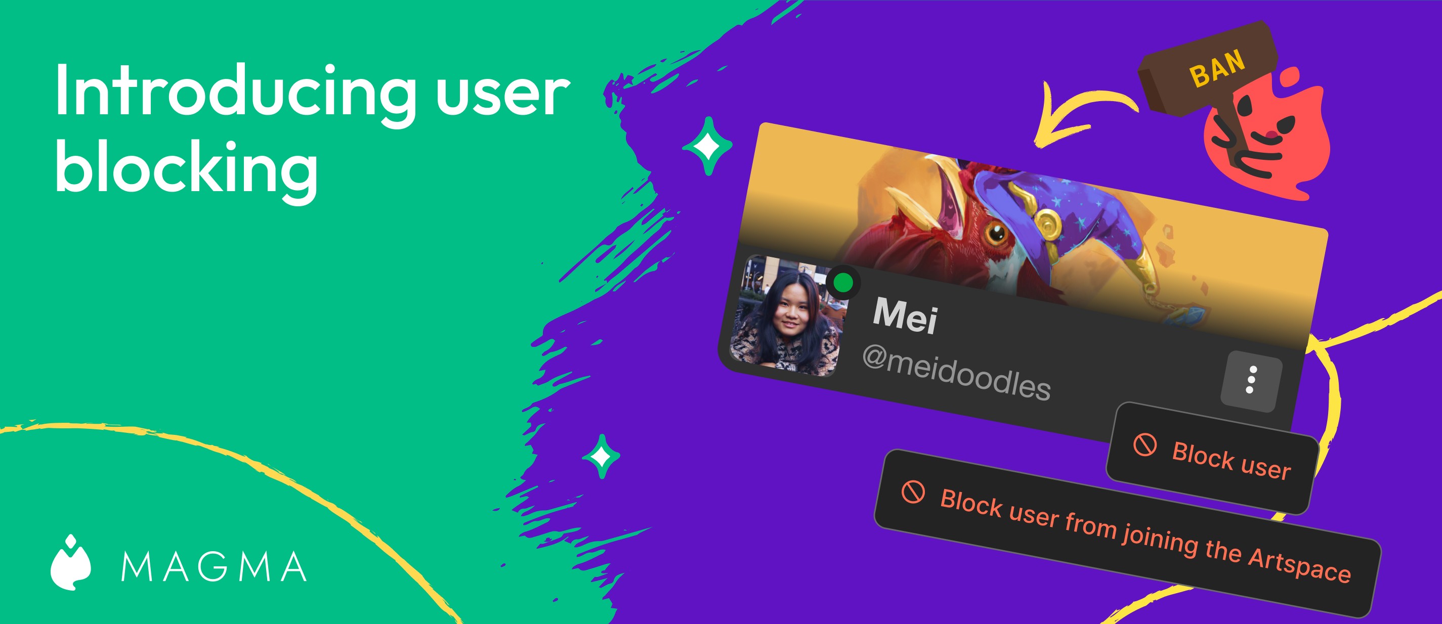 We’ve made it easier for you to ban people from your canvases and Artspaces, and even block their profiles completely. This is a long-requested feature since we released user profiles, and a necessary one as we build more social features into Magma.