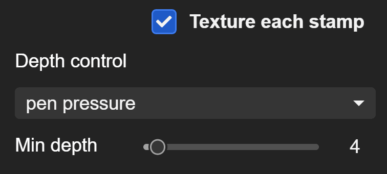 Depth control lets you use either pressure or tilt to adjust the texture's depth. When you have a low depth value for the texture, your brush looks more solid or has less texture. As you increase it, the texture becomes more apparent. When using pressure as a control, it starts with a more visible texture, but the depth reduces as you press harder.