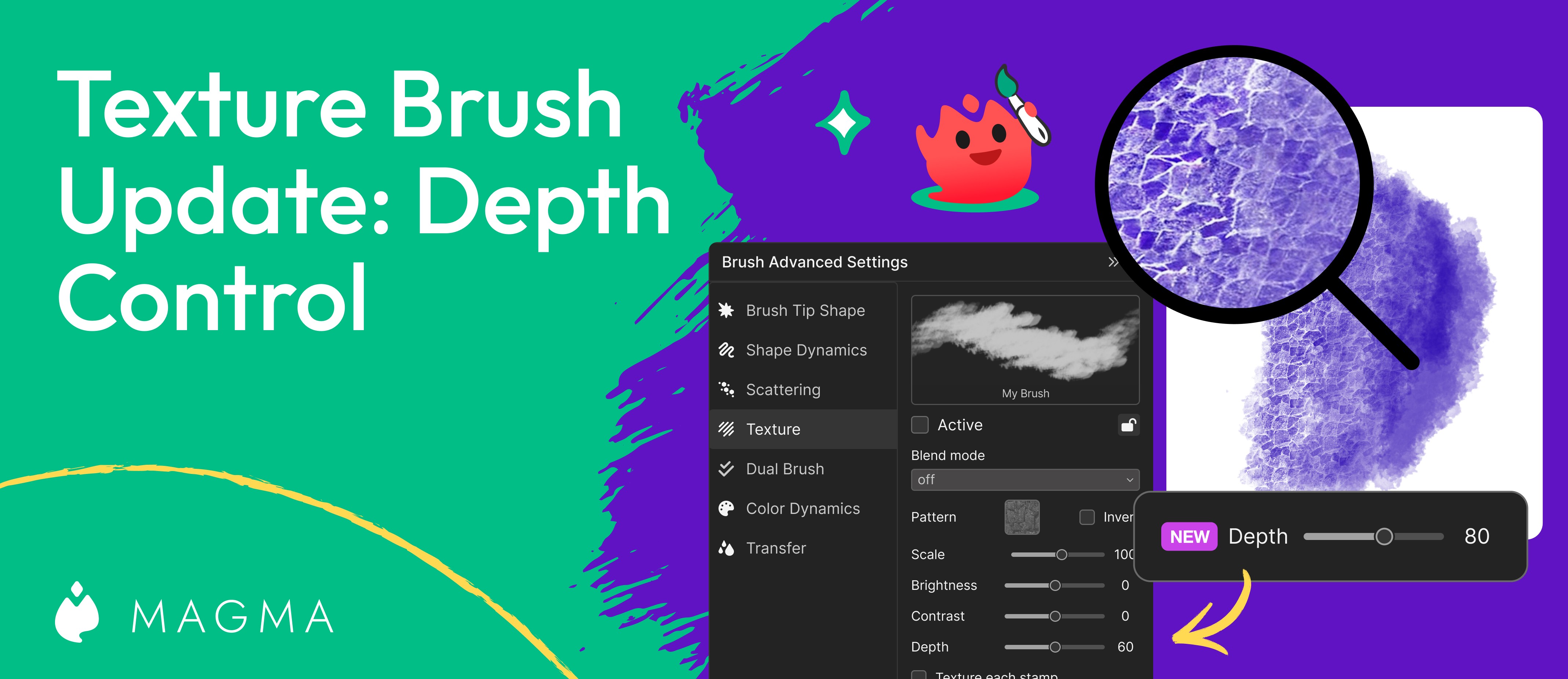 We recently released the Texture setting for your brushes. Now we’re adding new settings for it, specifically: Depth control and more blend modes.