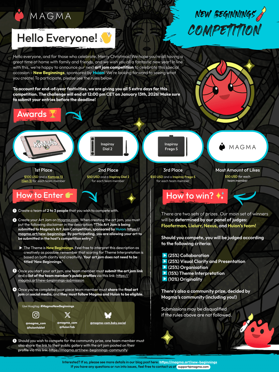 Instagram: #MagmaNewBeginnings and tag Huion and Magma in the post (@huiontablet and @magma_com).